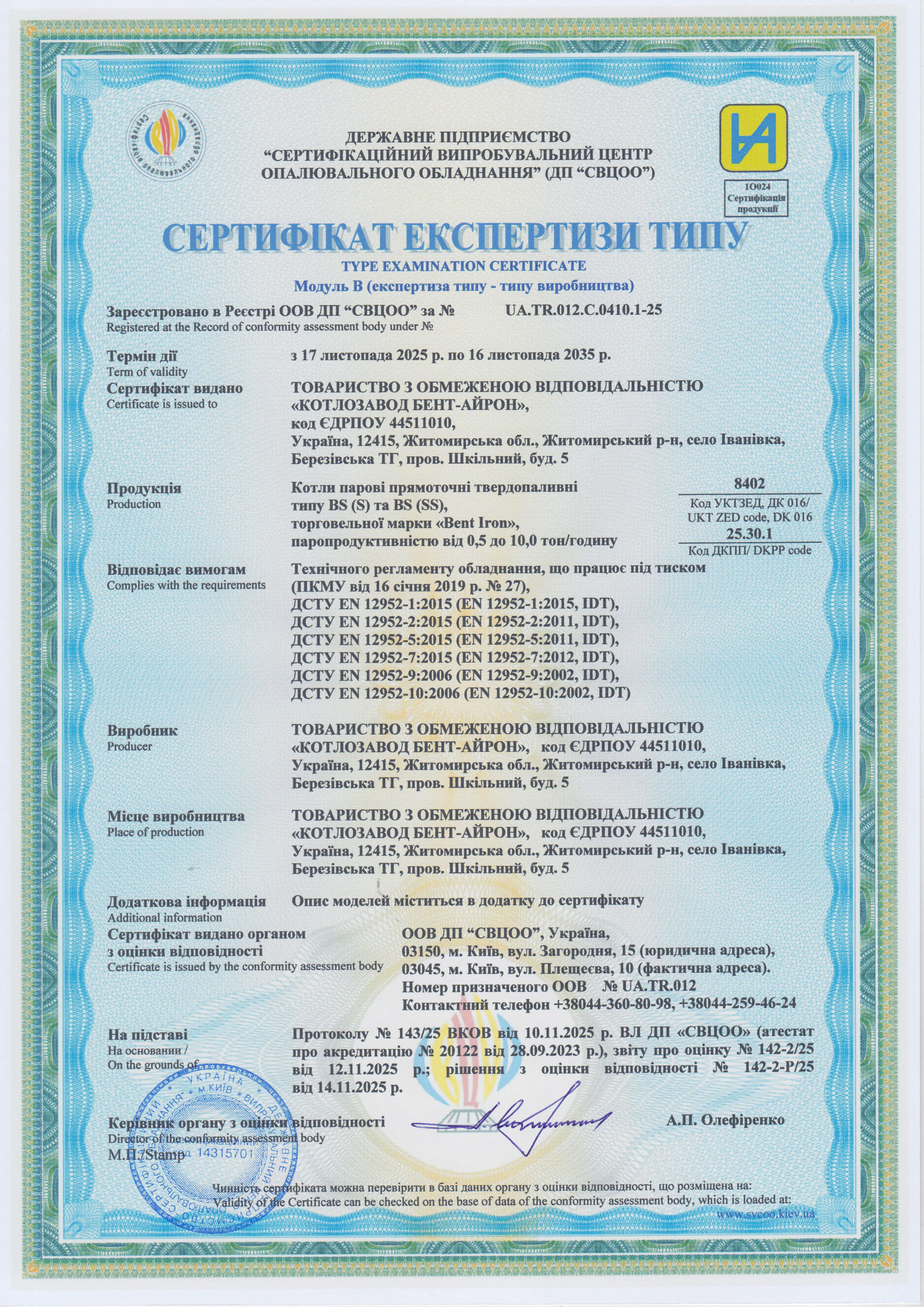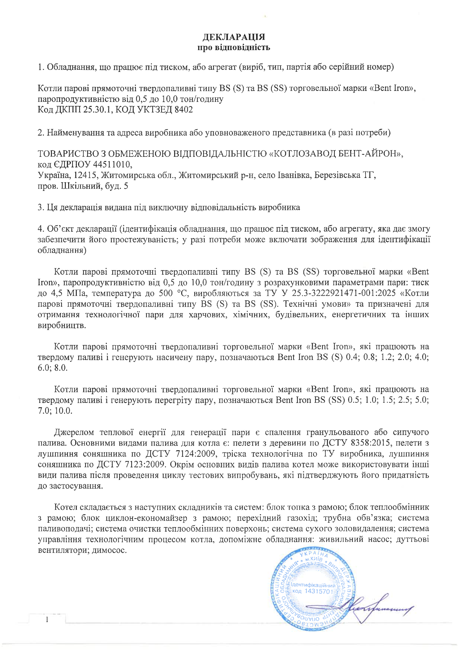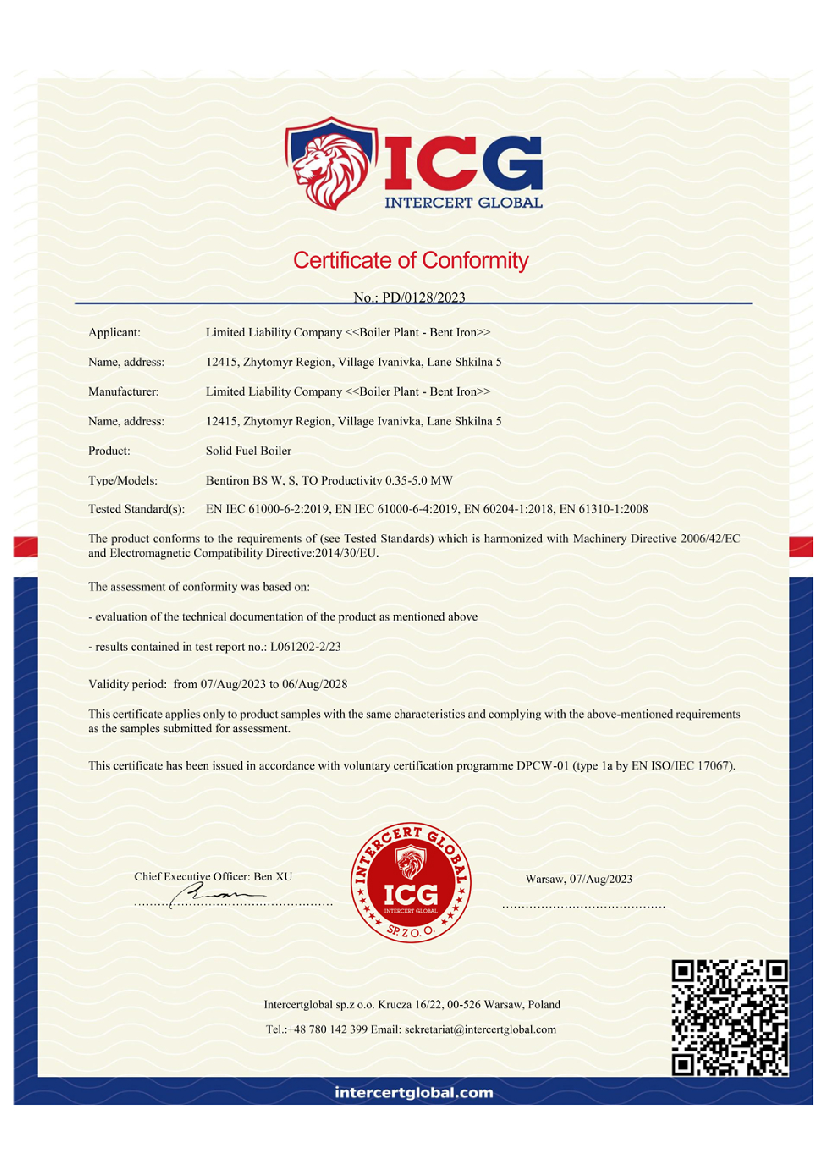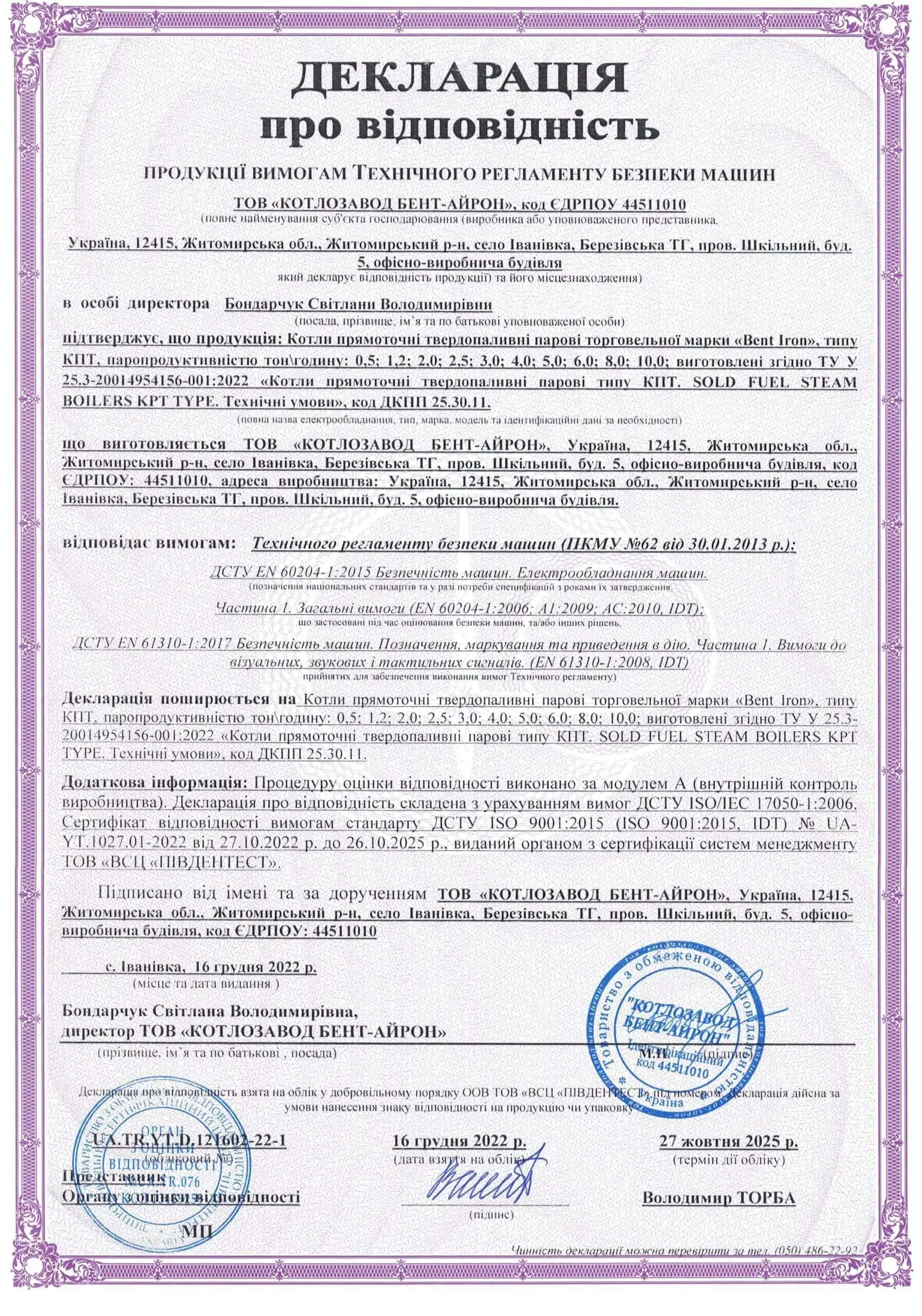 модельний ряд твердопаливних парогенераторів «BENT-IRON»