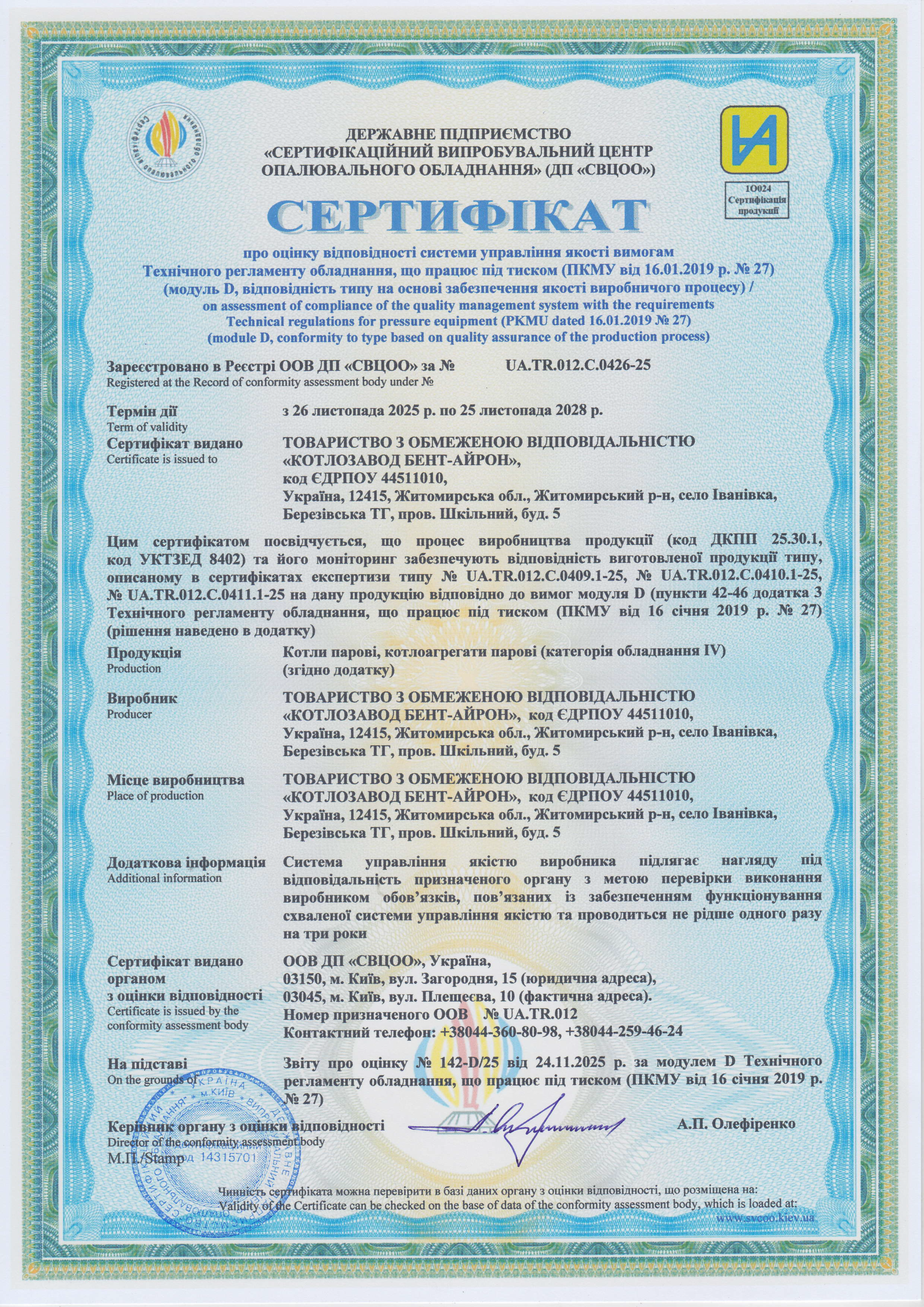 Номінальна паропродуктивність: 1500 кг/год